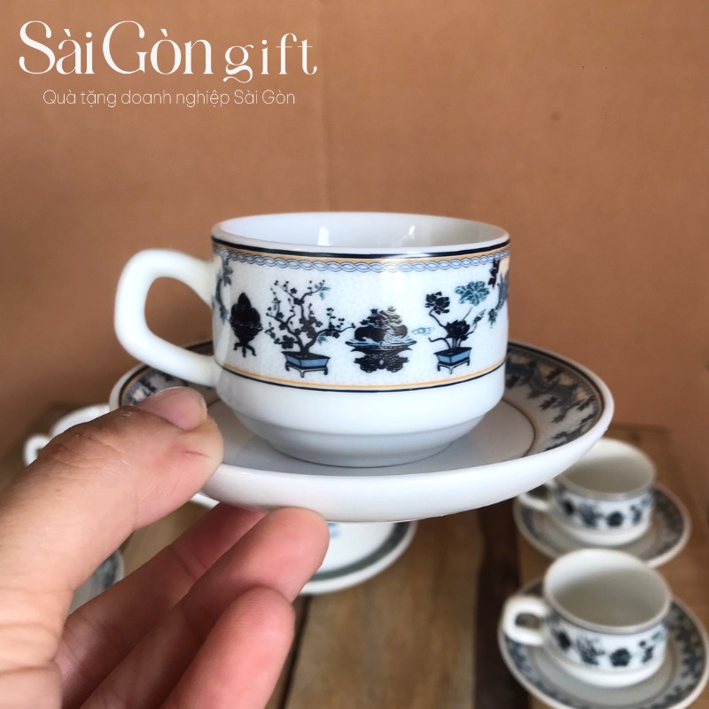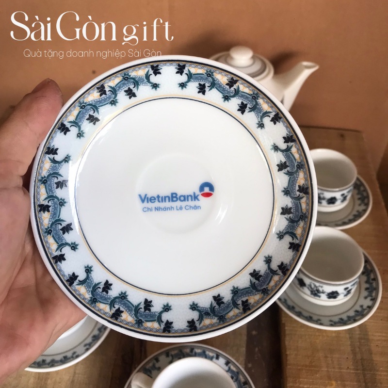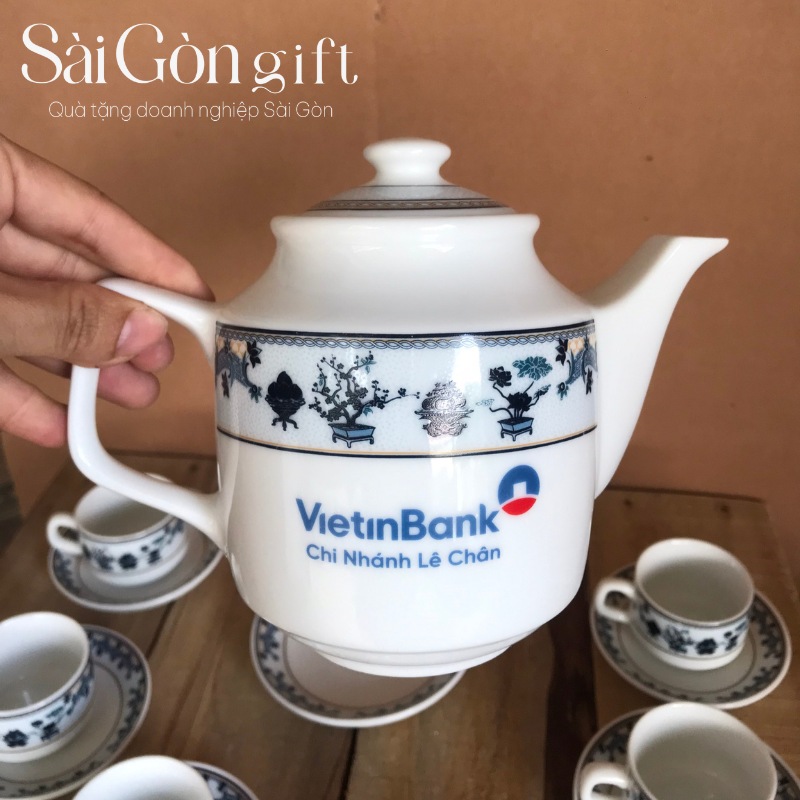 Bộ trà vẽ hoa văn của sứ Minh Long quà tặng in logo VietinBank