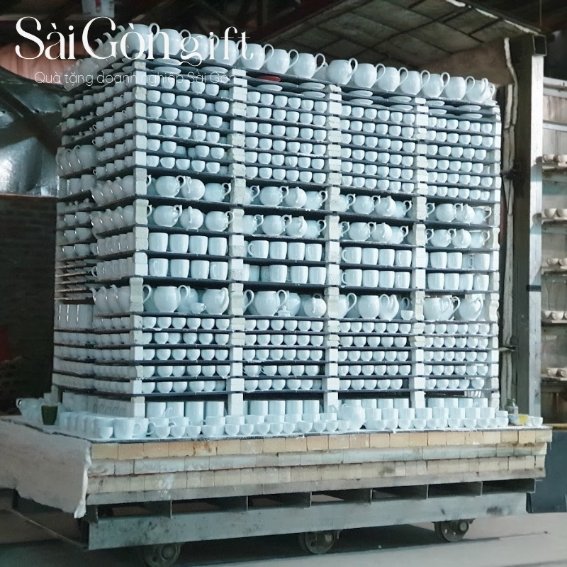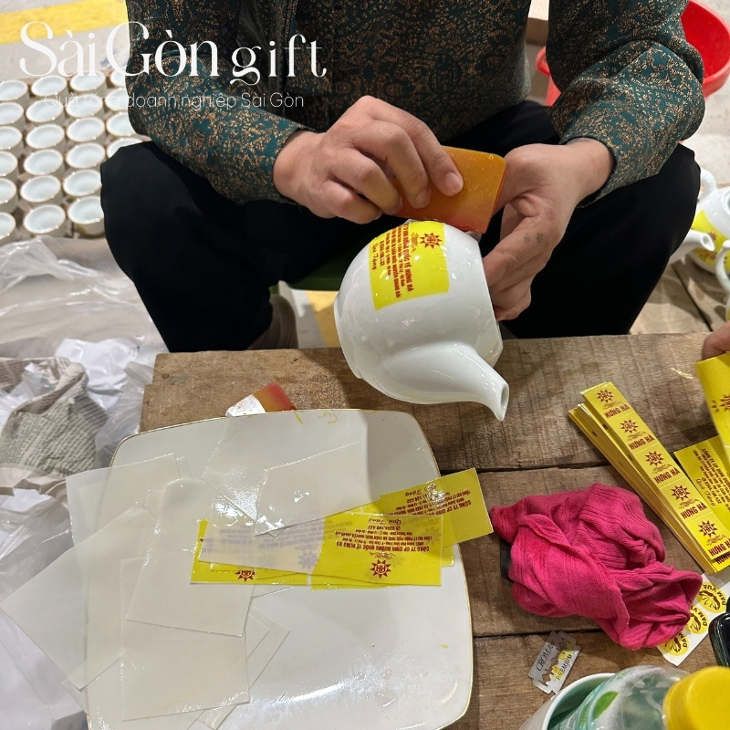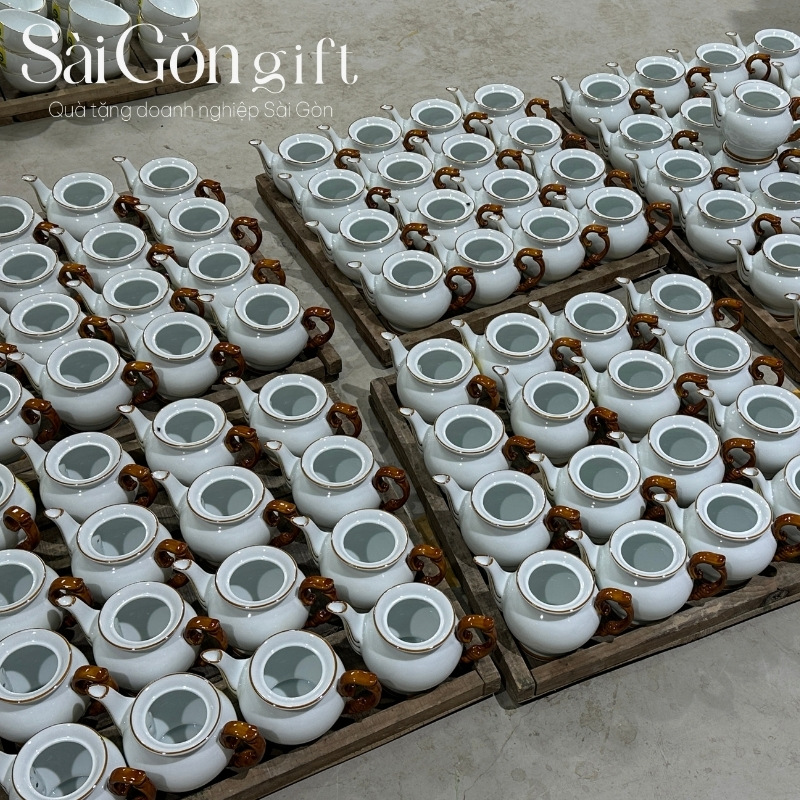 Quy trình sản xuất ấm chén quà tặng tại Sài Gòn Gift bao gồm: Tư vấn & Chốt giải pháp, Thiết kế & Trình duyệt mẫu, Sản xuất phôi & In logo hàng loạt, Kiểm tra chất lượng và cuối cùng là Đóng gói & Bàn giao.